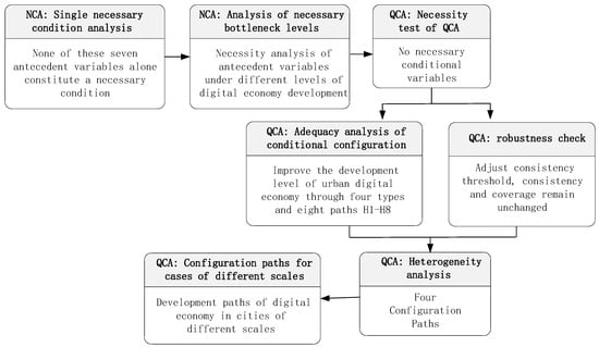 The QCA method takes a holistic analysis perspective, considers the research objective as the configuration of different combinations of conditional variables, integrates the advantages of case and variable studies, and obtains the set relationship between element configurations and results through set analysis. This helps to solve causal complexity problems such as multiple concurrent causal relationships, causal asymmetry, and the equivalence of multiple solutions []. Alternatively, the NCA is a novel method based on complex causal relationships []. Compared with QCA, it can identify the necessary conditions for the outcome variable and quantitatively assess its effect along with the bottleneck level as a necessary condition []. Therefore, this article employs a combined approach of NCA and QCA to analyze the degree of necessity and distribution characteristics of various antecedent variables across different levels of digital economic development, as well as the configuration paths for the development of the digital economy in Chinese cities. The analysis process is shown in Figure 2.