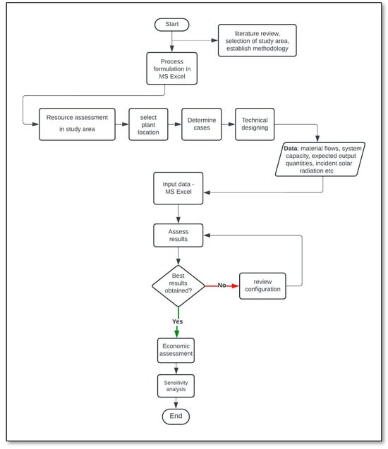 The objective of this study was to develop a technical design for a hybrid renewable WTE system for the Greater Accra Metropolitan Area in Ghana and assess its techno-economic viability within a broad circular economy context for GAMA. Achieving a circular economy within a city in Ghana will require three major initiatives: (1) government policy (regulation, planning, procurements and markets), (2) citizen participation (values, attitudes and knowledge) and (3) development of the physical environment (infrastructure, waste management, energy and material security) []. This study, therefore, aimed to directly support the policy and planning direction of the government in terms of enhancing the physical environment within the city and amassing greater citizen participation. It also sought to develop a technical, economical and environmentally viable city-scale model for waste management infrastructure.