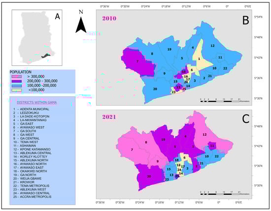 Population in the study area, showing the increasing population and geographical expansion between 2010 and 2021. Map (A)—location of study area in the Greater Accra Region of Ghana; Map (B)—population in 2010; Map (C)—population in 2021.