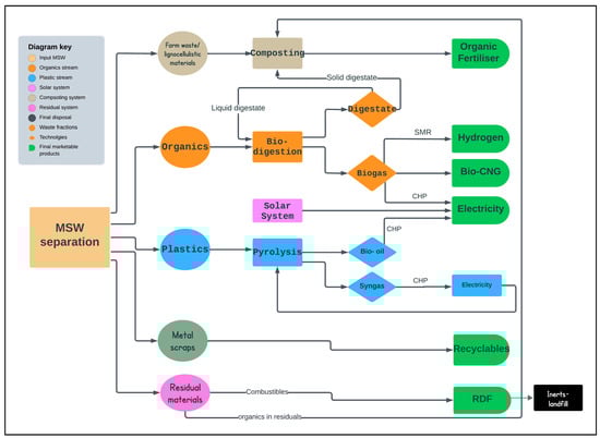 Several studies have established various strategies that can be adopted by municipalities to improve the current situation. These include source segregation and recycling [,], energy recovery from organic waste [], composting [], biochar from organic waste [], conversion to fuels such as RDF [] and hydrogen [], pyrolytic bio-oil [] and composite materials for road construction []. All these treatment strategies provide a one-sided approach, while treating only some types of wastes. Nonetheless, within the broader context, such mini strategies can be encapsulated into a city-scale circular economy [].