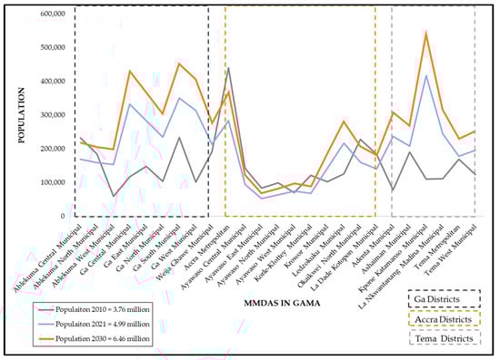 This study focused on the Greater Accra Metropolitan Area (GAMA), which consists of 25 out of the 29 MMDAs within the Greater Accra Region. The capital of Ghana, Accra, falls within the Accra Metropolitan Assembly (AMA), which is one of the MMDAs in GAMA (Figure 2). The impacts of migration and urbanization have resulted in the geographical expansion of the population beyond the AMA to adjoining municipalities and districts, to form the GAMA or the city of Accra. A recent study revealed that the built-up area within the GAMA increased from 27% in 2008 to 46% in 2017 and is expected to reach 73% by 2030 []. The term “metropolitan area or city” encompasses the metropolis and 23 adjoining municipalities and districts. Some studies have also described it as a sub-region [,].