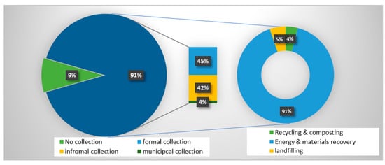 One of the key aspects of circular economy is the creation value and markets for resources within the cycle. This value creates a push and pull effect, ensuring the continuous cycle of materials within the system. A circular city requires business models with various scopes: collective citizen actions, the city governance level, local service providers or international networks []. At the core of those, the recovery of materials and energy is crucial for every circular economy. Two African countries have implemented ambitious waste-to-energy (WTE) projects within the last decade, to deal with their increasing waste, which must be scaled up. In Ethiopia, a 25 MW WTE plant started operations in 2019 and supplies 30% of the city’s energy needs []. In Ghana, a pilot hybrid WTE plant is under construction and is expected to generate 810 MWh/year of energy for grid supply with other potential alternative fuels [,]. Within a circular economy framework, these projects make a contribution toward the achievement of sustainable cities.