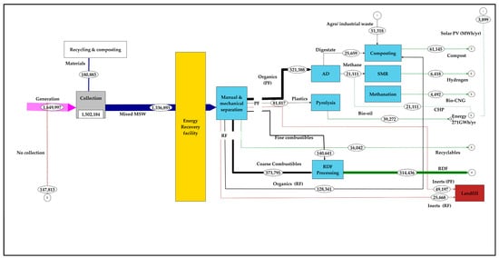 The data on resource assessment from the previous section were transferred into STAN software 2.7.101 to model the material flows through the system. The STAN software provides a comprehensive platform for assessing the material flows from a system and computing the mass balance []. A material flow projection for the GAMA by 2030 was developed using the current data for material flows for the GAMA, sourced from previous studies published between 2015 and 2021 [,,,,]. The ratio of the various material flows in these studies was used to project the flows from waste generation in 2030. This assumed that the components of the waste management system in the GAMA will expand at the same rate as in 2021.