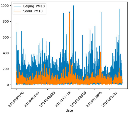 Figure 1 compares Beijing_PM10 and Seoul_PM10 in a graph from March 2023 to March 2017. Beijing_PM10 is shown in blue and Seoul_PM10 is shown in red. As shown in Figure 1, PM10 concentration in the two neighboring countries seems to be related, and Beijing_PM10 is almost higher than Seoul_PM10.