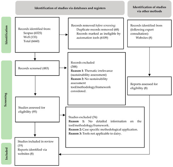 During the individual analysis of the 95 publications, 76 were excluded due to (1) not offering detailed information on the sustainability assessment tool, methodology, or framework; because they were (2) case-specific methodological applications; and (3) because the tool/methodology/framework could not be applied to the dairy sector. This yielded 19 relevant publications in total. Additionally, 8 relevant records were identified from websites following expert consultation, amounting to 27 total entries relevant to the study. Figure 1 shows a flow diagram of the research process.