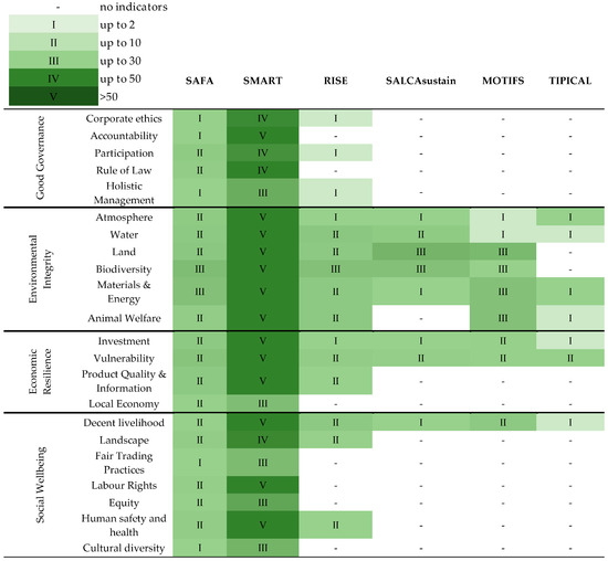 The SAFA guidelines present four key dimensions: good governance, environmental integrity, economic resilience, and social wellbeing. In this study, assessment was made regarding the number of indicators that the tools consist of in regards to the sub-themes listed in the SAFA guidelines. In good governance, the sub-themes include corporate ethics, accountability, participation, rule of law, and holistic management. Environmental integrity includes sub-themes such as atmosphere, water, land, biodiversity, materials and energy, and animal welfare. Economic resilience covers sub-themes like investment, vulnerability, product quality and information, and local economy. Lastly, social wellbeing comprises sub-themes such as decent livelihoods, fair trading practices, labor rights, equity, human health and safety, and cultural diversity. In Figure 2, the information provided in Table 2 is examined, specifically the dimensions of sustainability and the extent of coverage of the sub-themes. A hierarchical categorization is devised in Figure 2, with five distinct levels. Level (-) indicates the lack of indicators for the respective sub-theme, all the way to level (V) which denotes that more than 50 indicators address that theme in the respective tool. This shall provide an overview of whether certain sub-themes are addressed by the respective tool but does not depict whether the sub-themes are covered adequately, nor whether a certain tool should be considered as “the ideal tool”.