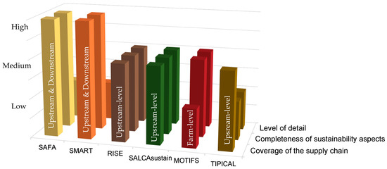 Category levels range from “low” to “high” in terms of detail or indicator type (where high denotes that the tool consists of more quantitative indicators and low of more qualitative indicators) and thoroughness (sustainability aspects included). Supply chain coverage includes “farm”, “upstream level”, and “upstream and downstream”. Upstream level consists of farm plus the input supply, while the downstream goes beyond the farm gate.