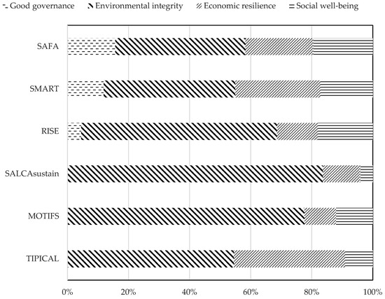 SAFA: Sustainability Assessment of Food and Agriculture; SMART: Sustainability Monitoring and Assessment RouTine; RISE: Response-Inducing Sustainability Evaluation version 3.0; SALCAsustain: Swiss Agricultural Life Cycle Assessment; MOTIFS: MOnitoring Tool for Integrated Farm Sustainability; TIPICAL: Technology Impact and Policy Impact CALculations; DSF: dairy sustainability framework; GG: good governance; EI: environmental integrity; ER: economic resilience; SW: social wellbeing.