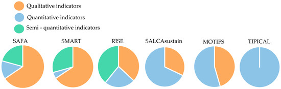 In terms of the outputs depicted in Table 2 and, visually, in Figure 5. TIPICAL offers all quantitative indicators. SALCAsustain and MOTIFS offer more quantitative indicators, mainly for the environmental and economic dimension. RISE contains mostly quantitative and semi-quantitative indicators. SAFA provides mainly qualitative and semi-quantitative indicators, which is also the case for SMART.
