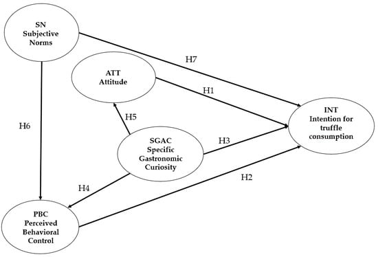TPB provides basic constructs, which are intention (INT) to carry out that specific act of consumption, attitude (ATT), subjective norm (SN) and perceived behavioral control (PBC). All these factors are determined by behavioral, normative and control beliefs, respectively. In the literature, several studies extend these constructs, such as awareness of sustainability, moral attitudes, health consciousness, territorial identity and recently also the impact of COVID-19 on purchasing intentions [2,22,23,25]. Also, our study extended the TPB framework by adding the food-specific curiosity (SGAC) construct in addition to the TPB core theory constructs.