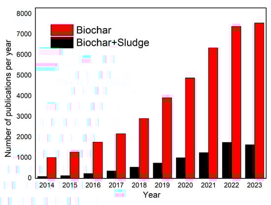 Evolution of the number of publications on biochar and sludge-based biochar between 2014 and 2023 (data from Web of Science; keywords used for search were “biochar” and “biochar and sludge”).