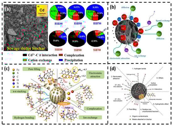 Mechanisms involved in the adsorption of (a) heavy metals, (b) phosphates, (c) pharmaceuticals, and (d) organic contaminates into sludge-derived biochar [52,53,54,55].