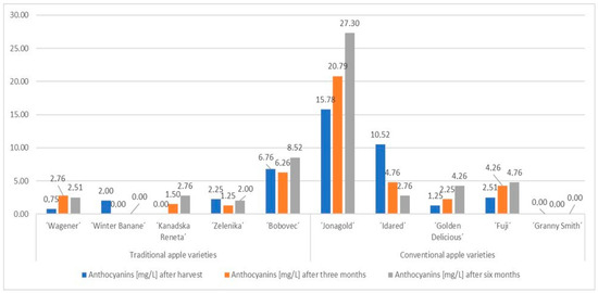 The content of anthocyanins (mg/L) in traditional and conventional apple varieties during cold storage.