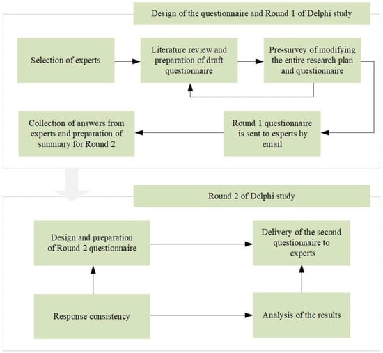 The classical Delphi method typically involves three steps: (1) identifying the research subject, specifying the research question, establishing a rudimentary conceptual model, and designing an appropriate questionnaire; (2) selecting a panel of participating experts; and (3) conducting a survey to collect experts’ opinions, often spanning two or more rounds.