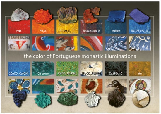 - Melo, M.J.; Castro, R.; Miranda, A. Colour in Medieval Portuguese Manuscripts: Between Beauty and Meaning. In Science and Art: The Painted Surface; Sgamellotti, A., Brunetti, B.G., Miliani, C., Eds.; Royal Society of Chemistry: London, UK, 2014; ISBN 9781849738187. [Google Scholar]