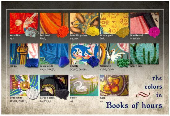 The medieval colors used in illuminated manuscripts from the 12th to 15th centuries were based on a luxurious and restricted palette dominated by a certain number of inorganic pigments and organic dyes, as described in Figure 1 and Figure 2. The medieval codex, with the Bible as its foundation, started in the monastic scriptoria and evolved into lay workshops for producing books of hours. To sustainably preserve these precious colors for future generations, we conducted interdisciplinary research at the frontiers of the social and natural sciences, promoting public engagement [].
