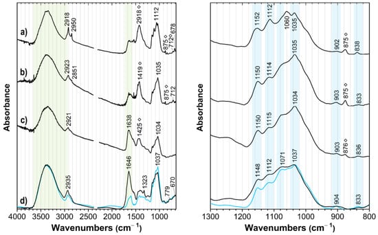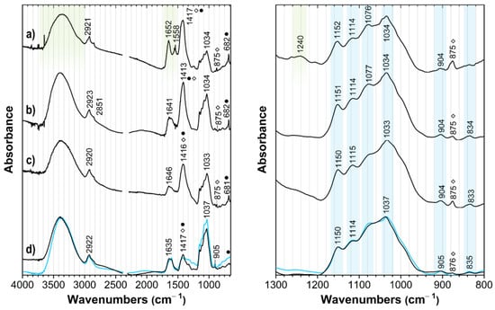 Infrared spectra of black paints with similar fingerprint to gum mesquite (blue spectrum and bands) (left) and close-up into the fingerprint region (right): (a) IL 42, fol. 133; (b) IL 21, fol. 88; (c) IL 12, fol. 1v; and (d) IL 19, fol. 91. In addition to gum mesquite, calcium carbonate (◊) and a protein are also detected (green bands).