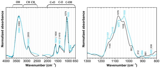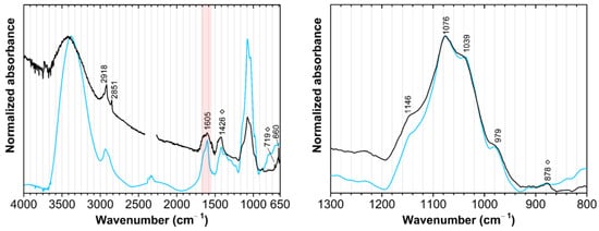 Gum arabic was identified in a red paint in Ms. 23, Figure 5. It is characterized by the presence of the maximum absorbance band at 1076 cm−1(ν(CO) + ν(OH)), and shoulders at 1146 (ν(COC)glycosidic bond), 1039 (ν(CC)(CO)), and 979 cm−1 [,,,,].