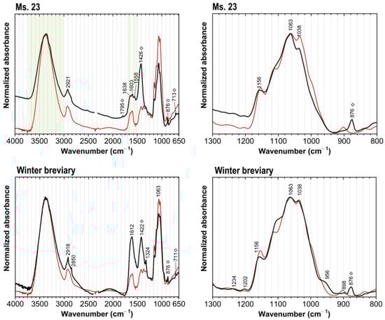 Infrared spectra of Ms. 23 and the winter breviary and close-up into the fingerprint region, compared to the mixture of gum mesquite and a cellulose-based material (red spectrum). In addition, calcium carbonate (◊) and a protein are also detected (green bands).