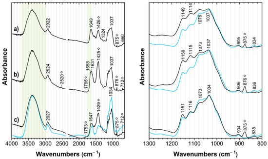 Previous research on the reconstruction of brazilwood recipes from the Book of All Colors has shown that adding calcium carbonate in the presence of alum produces gypsum []. This is due to the formation of calcium ions from the dissociation of calcium carbonate and the formation of sulfate ions from the dissociation of alum, resulting in the formation of CaSO4.2H2O []. Both calcium carbonate and gypsum are present in IL 15, IL 36, IL 42, and IL 21. IL 42 is particularly interesting for understanding this process, as shown in Figure 8a and Figure S18 (Supplementary Material). In the presence of high quantities of gypsum, the bands at 1112-6 cm−1 deformed the fingerprint region for identifying the polysaccharide.