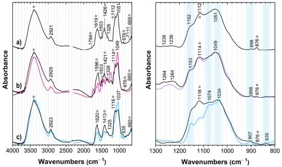 Infrared spectra of pink paints with similar fingerprint to gum mesquite (blue spectrum and bands) (left), brazilwood’s wood (pink spectrum), and the sum of brazilwood’s wood, gum mes-quite, and gypsum (purple spectrum) and the close-up fingerprint region (right): (a) IL 42, fol. 133; (b) IL 15, fol. 9; and (c) IL 15, fol. 84. In addition to the binder, calcium carbonate (◊) and gypsum (