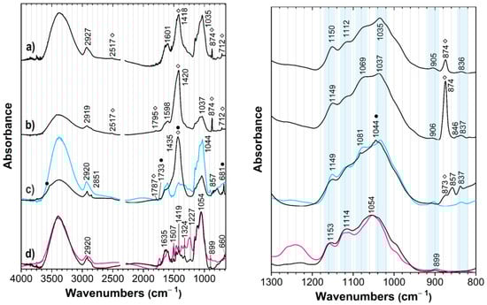 Infrared spectra of purple and blue paints with similar fingerprint to gum mesquite (blue spectrum and bands) and brazilwood’s wood (pink spectrum) (left) and close-up into the fingerprint region (right): (a) IL 42, fol. 9; (b) IL 42, fol. 133; (c) Ajuda Songbook, fol. 16; and (d) Ms. 22, fol. 76v. In addition to the binder, calcium carbonate (◊) and lead white (●) are also detected.