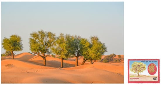 Prosopis cineraria (L.) Druce (left—on the red dunes of Dubai, United Arab Emirates; right—Indian postage stamp (1988 World Environment Day) representing the species Prosopis cineraria (L.) Druce [khejri]).