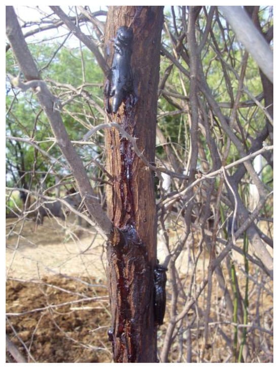 Gum arabic and mesquite come from these leguminous trees []. There are more than a hundred species that produce gum, commonly called gum arabic. According to Howes (1949), the name of this gum emerged because it was imported into Europe from Arab ports, explaining the name “Arabic”. It is also possible to find other names associated with this same gum, namely “Turkish gum” or “East India gum”, which, as previously explained, were derived from the place from which they were imported [].