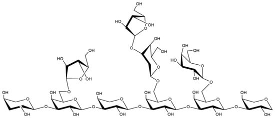 In structural terms, gums are composed of polysaccharides []. These structures comprise monosaccharide residues connected by glycosidic bonds [,]. There can be several differences between them, namely, the type of monosaccharide (one or more types), the kind of glycoside bond, whether the polysaccharide is composed of linear chains or linear chains with branches, and whether it is neutral or positively/negatively charged. These factors are essential for differentiating between gums, as will be discussed. The polysaccharides that compose the medieval gums are arabinogalactan proteoglycans type II, which also have a small percentage of protein (less than 10% or up to ~24%). Type II arabinogalactans comprise a backbone chain composed of β-D-galactose, with a β-(1 → 3) bond, although they have also been found with a β-(1 → 6) bond, Figure 12. Side chains of varying numbers are linked to this main chain. These side chains are linked to the main one by the β-(1 → 6) bond, and to these are connected to the arabinoses (Ara) by carbon 3 and 6. These units of arabinose can be replaced by galacturonic acid (GalA), glucuronic acid (GlcA), 4-O-methyl-glucuronic acid (4-O-MeGlcA), and rhamnose (Rha) [].