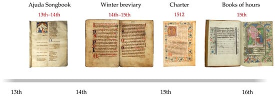 Standing as a monument to the Galician–Portuguese lyric, the Ajuda Songbook is an exceptional manuscript, replete with valuable illuminations (Figure S2, Supplementary Material) []. It was found in the 19th century at the Colégio Real (Royal College) in Lisbon and, in 1842, a quire and loose folios were discovered in the Biblioteca Pública de Évora (Public Library in Évora), pointing to its possible passage through Évora, sometime in its history []. It was left unfinished, a fact denoted by the lack of musical annotation and the unfinished clothes of the troubadours and minstrels represented in the illuminations [].