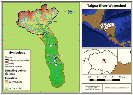 The Talgua River watershed is in the municipality of Catacamas, in the central-eastern region of Honduras (Figure 1). This watershed is part of the Sierra de Agalta National Park (SANP) and covers altitudes ranging from 480 to 2350 m.a.s.l. Its geographical coordinates are between 14°58′–14°53′ N and 85°49′–85°57′ W, covering an area of approximately 80 km2 [].