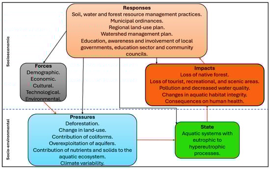 Applying the DPSIR model (driving forces–pressures–state–impacts–responses) (Figure 3), the driving forces related to the anthropogenic activities developed in the study area, the pressures exerted on the territory, the state of water quality, and the impacts originated because of land use were defined. Finally, a set of proposals are proposed based on each indicator of the model.