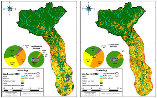 The study of satellite imagery shows that the Talgua River watershed, valley, and plains have undergone continuous deforestation, particularly in the valley and plains areas, where approximately 2400 hectares were transformed into pastures, agricultural crops, and urban areas by 2003. Deforestation has continued at a slower rate over the last 21 years, with approximately 1000 hectares deforested in the valley and plains areas and about 500 hectares in the watershed (Figure 5).