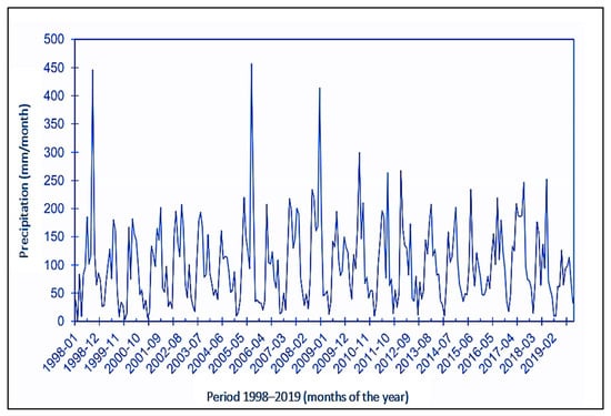 Time series of mean rainfall recorded during the period 1998–2019 in the study area (extracted and adapted from research by []).