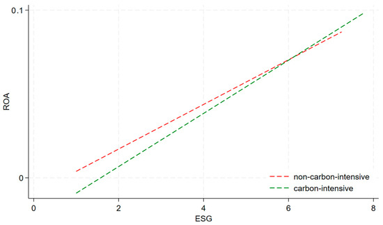 From the perspective of the enterprise’s environmental pollution, carbon-intensive enterprises generally pay more attention to environmental protection and take more green sustainable development measures [68], which not only help to reduce the enterprise’s operating costs, such as energy and resource use, but also reduce the negative impact on the environment. Carbon-intensive enterprises optimize their production processes and use clean energy, which not only reduces environmental risks but also establishes an environmentally friendly image, which positively impacts financial performance. Previous research has shown that carbon-intensive companies with high ESG ratings are better equipped to respond to regulatory pressures and social expectations [13]. By adopting better environmental practices, these firms can reduce their carbon footprint, resulting in cost savings and improved financial performance. In addition, high ESG performance in carbon-intensive industries can attract investment from socially responsible investors, further improving financial outcomes [12].