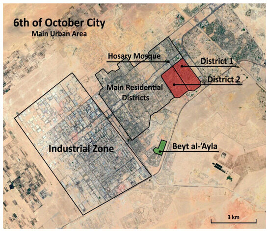 The first generation of new cities that surround Cairo was started in the 1970s [7]. Political motivations and urban expansion needs drove the decision to create new urban communities, influencing their naming. Two cities, the 6th of October City to the west—shown in Figure 1—and the 10th of Ramadan City to the east of Cairo, were named after the 1973 Egypt–Israeli war. The 15th of May City to the south was named after Sadat’s “reform revolution”. Sadat City, intended as Egypt’s administrative capital, briefly housed the Ministry of Housing before being relocated. Planning for these cities emphasized functional segregation, with commercial and service activities limited to specific areas. Private developers have also been involved in desert land development, creating gated districts with various names [8].