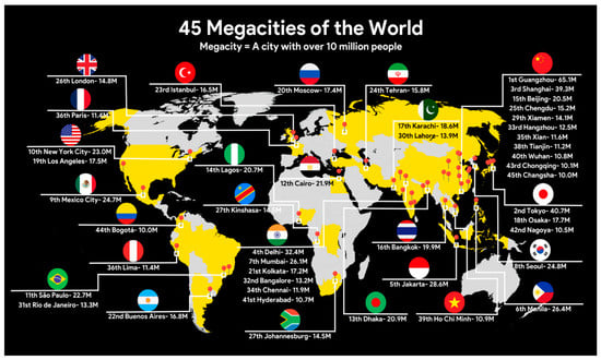 Megacities, as defined by the United Nations (UN), are urban areas inhabited by no less than 10 million individuals [9], as shown in Figure 2. This term has gained prominence due to the rapid urbanization witnessed over the past century. Tokyo, recognized as the first megacity, achieved this status in the 1970s [10]. Since then, numerous cities worldwide have attained this demographic milestone. The definition of megacity is obviously subjective because how a population is concentrated has the final say in distinguishing megacities from other urban areas, which are subjected to variations at different times. While Ancient Rome was a megacity with over one million in its population, London or Chicago, nowadays, can be considered megacities, although they fall below the ten million UN threshold [11]. Megacities are a result of the continuing urbanization. A megacity is typically distinct as a municipal zone with an entire population of over 10 million people. Megacities may be recognized from global cities by their swift development, novel forms of spatial population density, and both formal and informal economies, in addition to poverty, crime, and high levels of social disintegration. A megacity can be a solitary urban zone or two or more metropolitan zones that come together [12]. They represent a unique spatial form with strong internal coherence. Their activities and functions are closely interconnected within their boundaries, forming a singular entity despite diverse cultural and social backgrounds. Despite their vast territory, they function as cohesive units, with numerous individuals consistently utilizing the city’s space [13]. Forecasts indicate that the expansion of megacities will persist. The UN anticipates the existence of 43 such cities by 2030, with over half situated in Asia [14]. It is imperative for governments and policymakers to consider the complexities and potentials that megacities offer and formulate strategies that ensure sustainable and inclusive urban development.