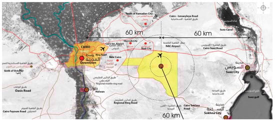 NAC location in the context of the Cairo region. Edited by the author. Source: The New Administrative Capital: The Egyptian case and the International experiences, Egypt today online, (2023). https://www.egypttoday.com/Article/1/33872/Housing-min-named-acting-prime-minister (accessed on 12 July 2023).