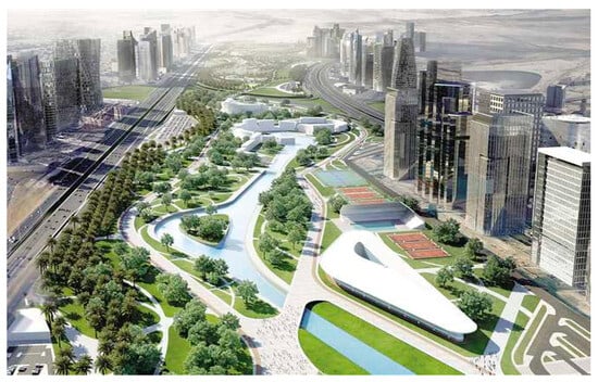 Green River Park, also referred to as Capital Park, is set to be a river-like series of large-scale urban parks located in (NAC). Source: https://worldarchitecture.org/ (accessed on 24 August 2023).