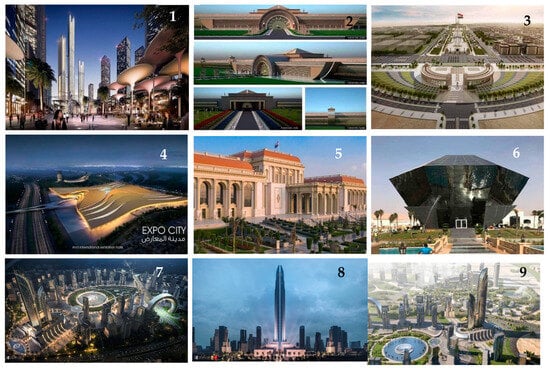 Several fundamental features and sustainability objectives distinguish the NAC as it pertains to sustainable architecture and holistic development. Notably, the NAC places a strong emphasis on harnessing renewable energy sources like solar and wind power, with the aim of reducing dependence on non-renewable energy resources. Additionally, the NAC actively encourages the utilization of public transportation, including trains, buses, and taxis, as a means to alleviate reliance on personal vehicles and curtail air pollution [20]. Another pivotal facet of the NAC’s design is its focus on verdant spaces and landscaping. The incorporation of numerous parks, gardens, and trees is envisioned to enhance the air quality and promote public health. Furthermore, the NAC considers access to public spaces a fundamental requirement for an improved quality of life [21]. But, by monitoring the reality and the projects that have been completed and those that are in the process of implementation, it is noticeable that the interest lies in giving priority to the formal aspect over the aspects of sustainability and compatibility with the surrounding context. (See Figure 8, which includes a variety of projects in the New Administrative Capital).