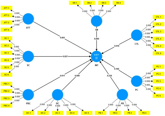 Assessing the predictive relevance of the model’s endogenous construct [66], guidelines were followed. Chin [77] suggests that a cross-validated redundancy (Q2) value above zero indicates model relevance. The endogenous construct INT achieved a Q2 value of 0.5906, confirming its predictive relevance. Table 5 and Figure 1 depict further analysis exploring direct relations between latent variables. The coefficient and path significance were evaluated in the structural model by employing the bootstrapping procedure.
