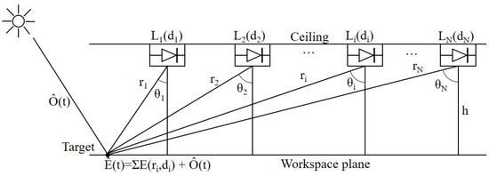 To design a lighting-control algorithm, we need to be able to calculate the illuminance produced by the luminaires. Assuming there are N luminaires, to calculate the illuminance by N luminaires, the set of luminaires is denoted by L, i.e., L := {1, …, N}, as shown in Figure 2. The total illuminance on the target plane at time t, given that the lighting-control system with N luminaires is on a daylight dimming vector , can be written as
