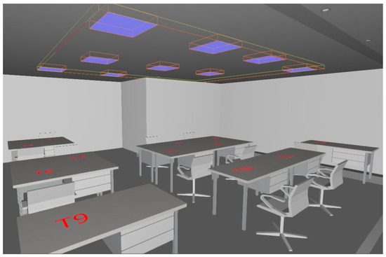 An illuminance simulation example of the proposed algorithms is presented in this section. We used the DIALux [37] lighting simulation software to calculate and display the illuminance distribution. To evaluate and verify the performance of the proposed algorithms, a testbed similar to the one used in [2] was constructed, as shown in Figure 3. The luminaires used were the 54 W and 19 W luminaires from the software, which were the most similar to the luminaires used in the reference paper to which this paper is being compared. The shape of the room and the arrangement of the tables were also designed as closely as possible to the room in the reference paper.