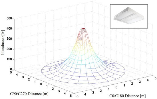 In this subsection, we propose an illuminance distribution function based on the LOS distance between the luminaire and the target work plane using the luminous intensity distribution provided by the luminaire manufacturer, the 3D location information of the luminaire provided by the IoT-based smart lighting-control system, and the 3D location information of the target work plane. The illumination calculation method using the LOS distance is advantageous in a practical environment because it uses the intensity of the wireless signal from the user terminal, such as a WiFi signal from a smartphone, or a wireless sensor device. Recent experiments in WiFi-based indoor positioning systems (IPSs) have shown that IPSs achieve a true positive rate of 99.91% and a false positive rate of 1.81% in LOS scenarios, with a measurement resolution of 5 cm, and achieve a localization accuracy of 1–2 cm, with a measurement resolution of 0.5 cm [26]. In our simulation environment, the accuracy of 2 cm is accurate to 1% of the vertical distance between the luminaire on the ceiling and the workspace plane of the user. The distance-measurement method using WiFi is useful when the target object moves. However, using radio signals to locate the target work plane has the advantage of pinpointing the user’s location; however, it requires the use of a radio signal-generating device, and the user’s location can be a legal issue from a privacy perspective. Therefore, despite the availability of precise indoor positioning technology, we only consider the target work plane with a fixed position entered directly by the user in the IoT-based lighting-control system. This may be a better approach when considering lighting environments where the location of the work plane is more important than the location of the worker. Also, the luminaires in our proposed lighting-control system have their own location information, so we only need to know the location of the target work plane to calculate the LOS. In this paper, we use the previously measured distance provided by the simulation tool because we are going to simulate a fixed target and use the simulation testbed from [2].