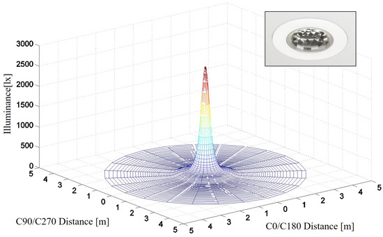 Instead of calculating the distance using the three-dimensional position information assigned to the luminaires in the proposed lighting-control system, we measured the LOS distance r using the measurement tool in the DIALux simulation tool. Using the photometric data files provided by the manufacturer, the photometric polar diagram function is recalculated as a function of .