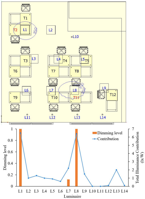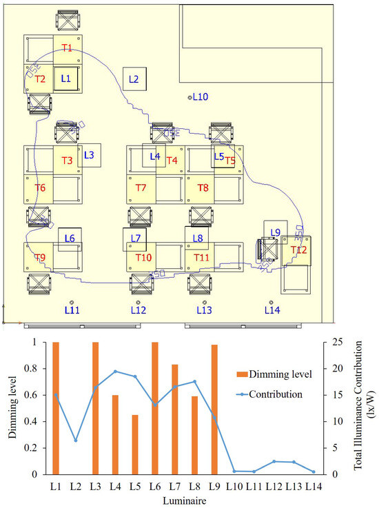 Consequently, a luminaire’s high illuminance contribution means that it is located close to a specific workspace or is involved in the illumination of multiple workspaces. Conversely, a luminaire’s low illuminance contribution means that there is a lack of workspace around the luminaire that needs to satisfy the illuminance requirements. These low-illuminance-contribution luminaires are the ones for which cognitive-based control is appropriate. The next step is to select luminaires based on their illuminance contribution and determine their dimming levels. Lower the dimming level for luminaires with low light contribution, and increase the dimming level for luminaires with high light contribution. This is repeated to satisfy the illuminance requirements for multiple workspaces.