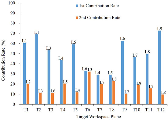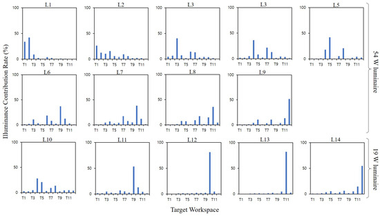 Unlike Scenario II, in Scenario I, the total illuminance contribution and dimming levels calculated by the DIC-LCA do not match, as shown in Figure 6. However, if we check the contribution of individual luminaires to each workspace plane, it can be seen that there is a correlation. In Figure 8, the first and second contribution percentages represent the illuminance contribution percentage of the highest and second-highest luminaires to each target workspace plane. The illuminance contribution percentage is a percentage that contributes to the total illuminance of the target workspace plane and indicates the importance of the luminaire selection for lighting control. As shown in Figure 8, the contribution of certain luminaires, such as L1, L6, and L9, to a particular target workspace plane, such as planes T1, T2, T9, and T12, located at the corner, is relatively high compared to that of other luminaires. In Figure 9, the illuminance contribution percentage of each luminaire to each target workspace plane is shown. In Figure 9, the illuminance contribution distribution of each luminaire to the target can be seen. The 54 W LED luminaire has a constant contribution to the workspace planes around the luminaire, while the 19 W LED luminaire has a higher contribution to the closest workspace plane. This reflects the characteristics of the illuminance distribution diagram of each luminaire, as shown in Figure 4 and Figure 5. In particular, we can see that the 19 W LED luminaires are focused exclusively on specific targets on the workspace plane. This means that, if we do not place a spotlight for a specific target well, we need to reduce its use to save energy. In other words, adjusting the position of the 19 W LED spotlight can save more energy.