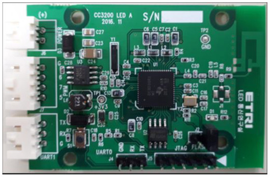 For real environment testing, as shown in Figure 10, we developed a lightweight lighting controller using the Texas Instruments (Dallas, TX, USA) CC3200 SimpleLink™ WiFi and IoT solution, which is a low-power WiFi microcontroller unit (MCU) for IoT devices. In our proposed lighting controller, the power consumption of CC3200 is at least 195 mW in receive mode and 756 mW in transmit mode [38]. The measured power consumption of the WiFi lighting controller, which includes switched-mode power supply (SMPS) and pulse-width modulation (PWM) module, was less than 1 W. Considering the power consumption of the 14 WiFi lighting controllers, the total power consumption was also reduced to 364 W for all 12 desks and to 127 W for the 2 desks, less than [2]. If we use the low-power WiFi module developed for the IoT, the power consumption of the WiFi module will be a small part of the total power consumption of the lighting-control system.