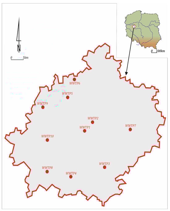 The data presented in this study are average values for 10 different municipal wastewater treatment plants (WWTP) over 7 consecutive years. The installations selected for the study are located in Poznań County, as presented in Figure 1. Sewage sludge samples came both from large facilities, serving a large urban agglomeration, and from small, local installations, serving smaller towns. Consequently, individual wastewater treatment plants differ in their designed size expressed as the equivalent number of inhabitants (ENI: from 9100 to 1,200,000) and average capacity Q (m3/d) (from 820 to 200,000). Each of the WWTP works in the same modernized Bardenpho system with the removal of carbon, nitrogen, and phosphorous compounds in a low load active sludge process. This system consists of five distinct reactors: an anaerobic reactor, the first anoxic reactor, the first aerobic reactor, the second anoxic reactor, and the second aerobic reactor. All the selected WWTPs meet the required parameters of wastewater purification and its efficiency, expressed as a percentage reduction of individual parameters exceeding 96%. Sewage sludge from individual WWTPs was subjected to the same conditioning processes (degassing, equalization, dewatering, and compaction) and represented stabilized material according to the standards adopted for a given installation. The approximate mass of generated sewage sludge (t/year) for individual WWTPs ranged between 450 and 20,000 t of fresh matter per year.
