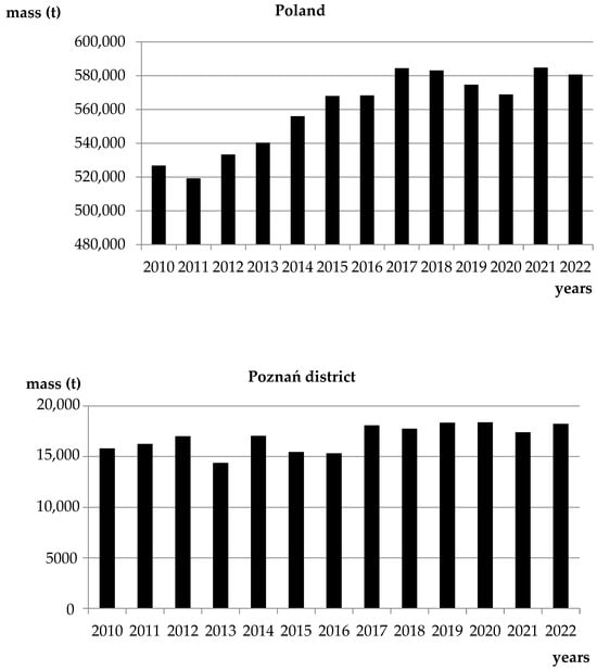 Currently, there are 3258 municipal WWTPs in Poland, with a majority working in the mechanical–biological system in terms of the biogenic compound removal []. The introduction of more advanced technologies based on multi-phase biological reactors for the integrated removal of carbon, nitrogen, and phosphorus compounds promotes more effective wastewater treatment, but inevitably it has led to the generation of greater SS mass. Another factor that clearly leads to the production of more SS is the expansion of the water supply network and connecting a larger number of inhabitants to it. The importance of these factors in the production of SS is evidenced by data from the Local Data Bank []. According to the cited data comparing the last 12 years (2010–2022), the amounts of SS increased by 10% in that period for Poland and by 15% for Poznań County (Figure 2). In both cases, there is a trend of increasing SS mass, although in the case of Poznań County it was more pronounced. This is due to the fact that in this area, a significant increase in the population was recorded in that period. This is closely related to better opportunities for education and employment in many sectors of the economy. Moreover, local authorities have intensified work on sewage treatment in the entire area.